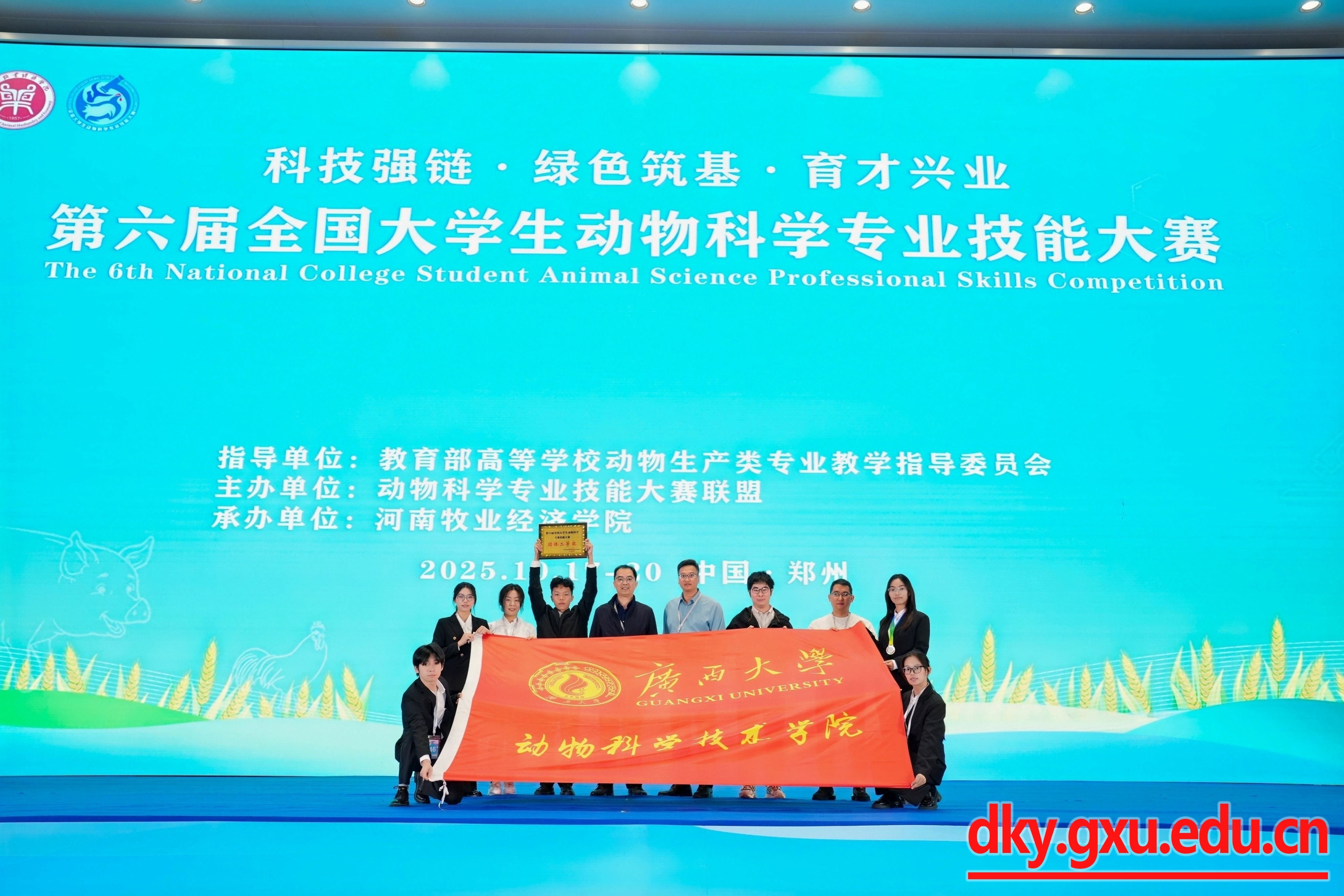 10月17日-19日,由全国动物科学专业技能大赛联盟主办的“第六届全国大学生动物科学技能大赛”在河南牧业经济学院举行,来自全国73所涉农本科高校的参赛队伍同台竞技。由广西大学动物科学技术学院院长陆阳清,副院长蒋钦杨带队,黄艳娜、许惠艳、刘兴廷、梁晶、孔志伟和马杰等老师指导,动物科学专业黄好婷、刘亦婷、黎忠豪、谢晓玲、甘凯文等5名本科生组成的参赛队伍,经过紧张激烈的比赛,动科学院队获团体二等奖、项目一“生态畜牧场规划设计”单项一等奖。