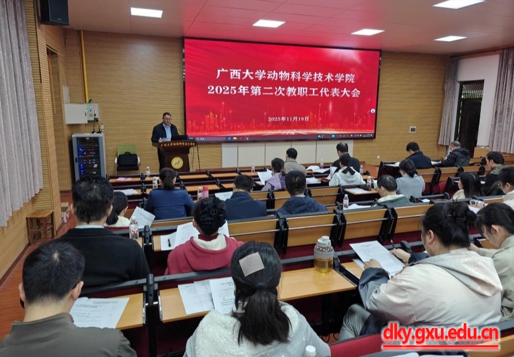 11月18日下午,广西大学动物科学技术学院2025年第二次教职工代表大会在学院318报告厅召开。动物科学技术学院党委书记韦小强,院长陆阳清,副院长何家康、韦祖樟,学院教代会代表参加会议。动物科学技术学院副院长、分工会主席郭爱涛主持会议。大会审议并通过了《动物科学技术学院2025年贡献绩效工资分配方案》《动物科学技术学院分工会2025年会费收支情况报告》。