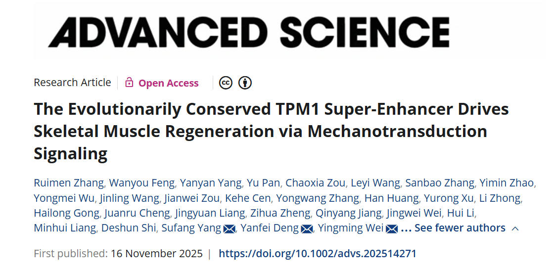 近日,广西大学动物科学技术学院动物生殖调控与遗传改良团队在牛骨骼肌发育研究领域取得重要进展。该研究揭示了表观遗传调控与细胞机械力学如何协同调控牛肌肉干细胞(MuSCs)分化及肌肉发育的机制。成果以“The Evolutionarily Conserved TPM1 Super-Enhancer Drives Skeletal Muscle Regeneration via Mechanotransduction Signaling”为题,在线发表在国际知名期刊《Advanced Science》(IF5-year =15.6)。论文的第一作者为动物科学技术学院助理教授张瑞门,通讯作者为农发院教授韦英明、动物科学技术教授邓彦飞及杨素芳,广西大学为该论文的第一完成单位。