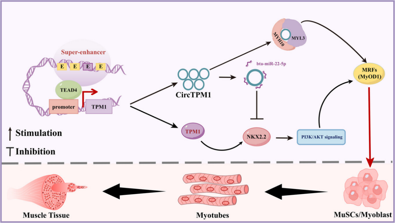 牛肉作为全球公认的重要动物蛋白来源,具有显著的经济价值,在保障全球粮食安全和消除贫困方面发挥着关键作用。骨骼肌再生是一个高度协调的过程,依赖于MuSCs的定向分化能力。超级增强子作为关键的表观遗传调控元件,能够高效驱动细胞命运决定基因的表达。本研究通过跨物种(牛、小鼠、人)基因组数据分析,首次揭示了TPM1基因超级增强子(TPM1_SE)在骨骼肌再生中的核心、保守性作用,阐明了其通过整合表观遗传调控与细胞机械力学信号,协同促进肌肉生成的新机制。该研究不仅深化了对肌肉生成机制的理解,也为肌肉退行性疾病治疗和畜牧业肉质改良提供了新的理论依据和潜在靶点。