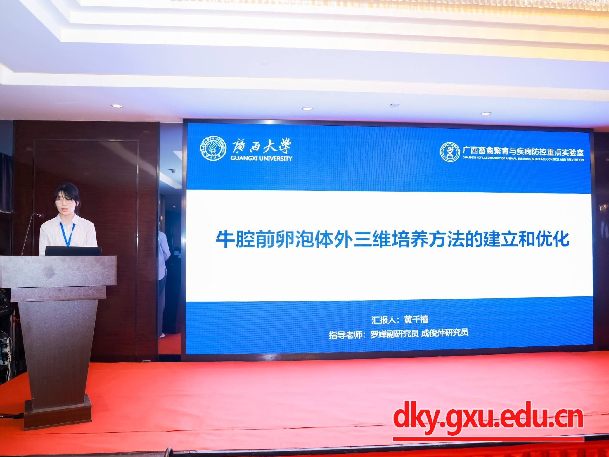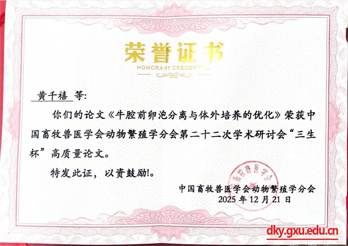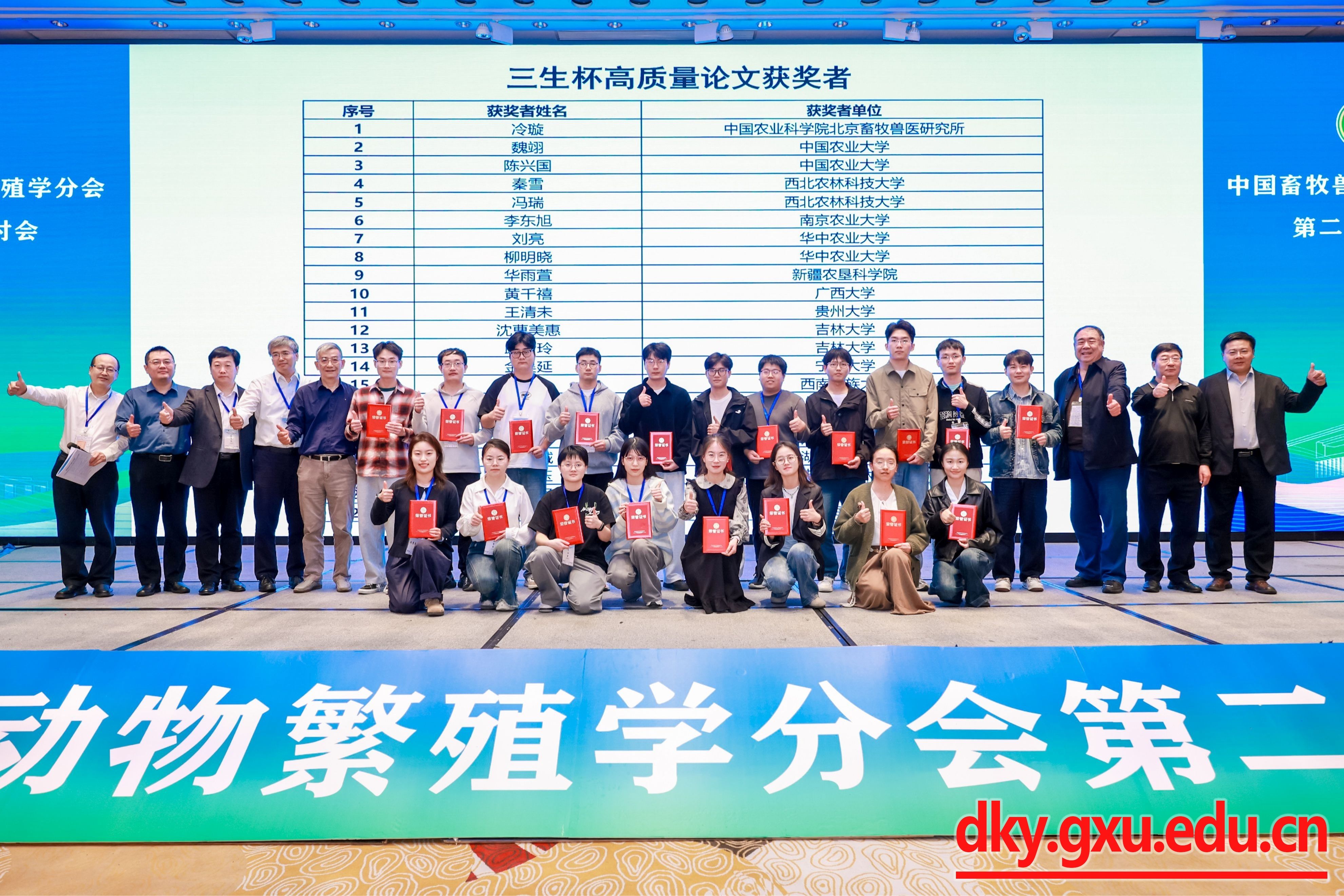 本次研讨会以“促进动物繁殖理论与技术创新,推动产业高质量发展”为主题,汇集了繁殖领域基础研究、前沿技术探索以及产业发展的最新进展和成果。会议交流内容包括特邀报告、青年学者论坛、论文摘要以及墙报。我院五名硕士研究生(黄千禧、吴毓滢、刘李、冯瑶、杨星)在青年学者论坛分别就腔前卵泡的体外培养、卵泡闭锁和黄体形成、母胎互作机制和早期妊娠诊断等新进展进行了口头汇报。此外,黄千禧同学还荣获了本届会议的“三生杯”高质量论文奖。