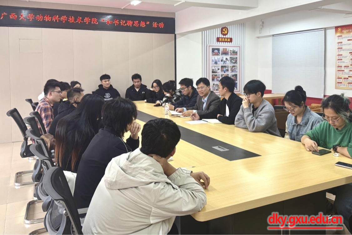 12月30日下午,广西大学动物科学技术学院党委书记韦小强走进学生社区,在西21栋党员活动室开展“和书记聊思想”活动,面对面了解2026届毕业生思想动态、就业进展、学习科研、日常生活等方面情况。动物科学技术学院团委副书记马朝阳,18名毕业班学生代表参加座谈。