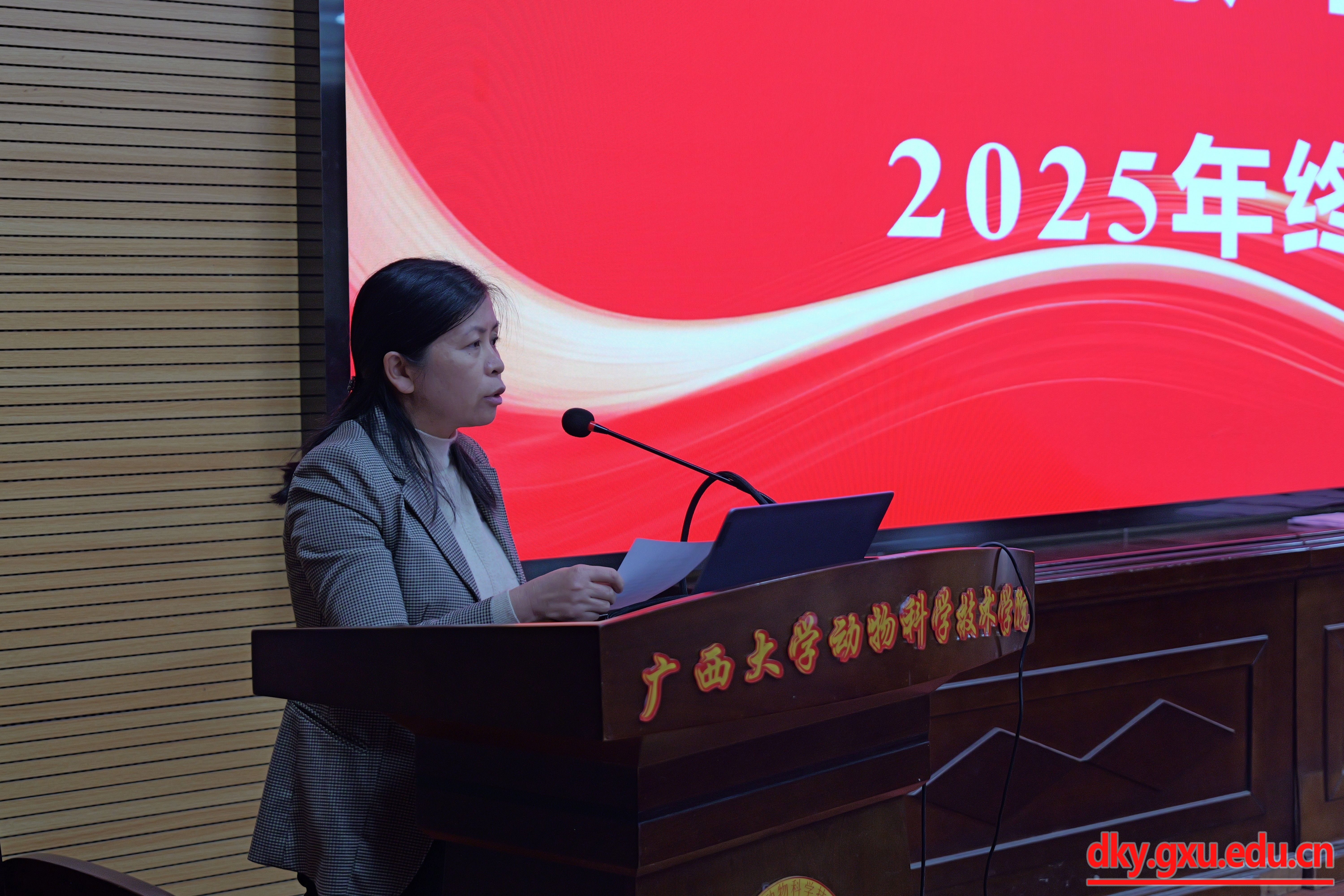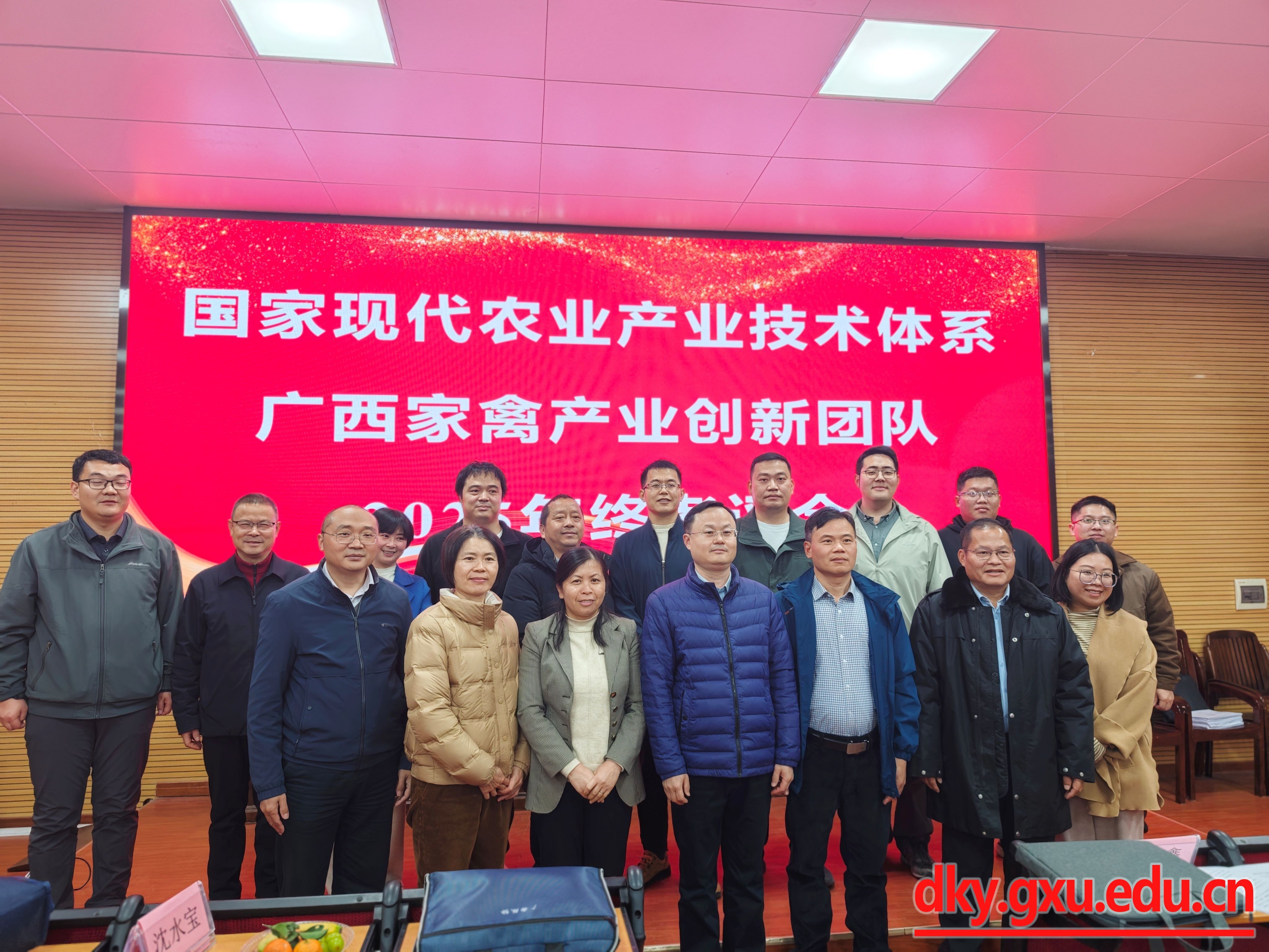 1月4日,广西家禽产业创新团队在首席团队依托单位广西大学动物科学技术学院召开了2025年度岗站专家年终考评会。会议由首席专家团队骨干杨祝良老师主持,产业行政主管部门谭华康副处长、产业推广部门刘瑞鑫副站长、产业企业代表覃俊江高级畜牧师,财务专家林命良高级会计师和首席专家杨秀荣教授组成考评专家组,岗位功能专家、综合试验站站长及技术骨干共20余人参会。