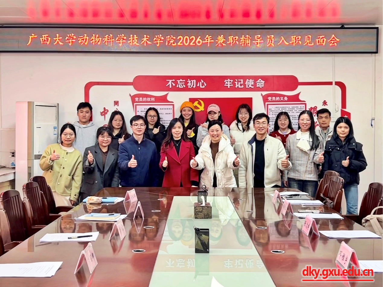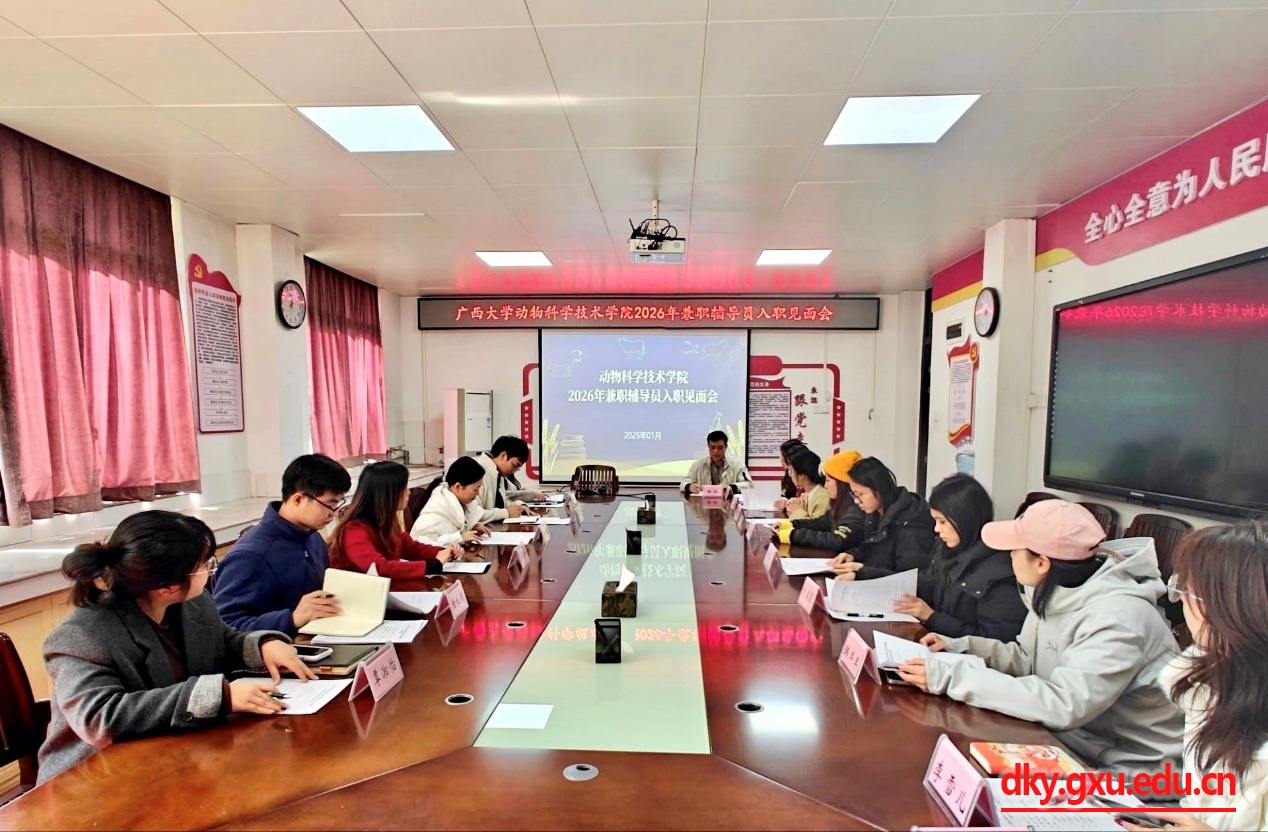 为加强学院学生工作队伍建设,帮助新入职兼职辅导员尽快熟悉岗位、融入角色,1月9日,广西大学动物科学技术在学院302会议室举办2026年兼职辅导员入职见面会。见面会由学院辅导员邹佳琪主持,学院党委副书记杨雪参加见面会。