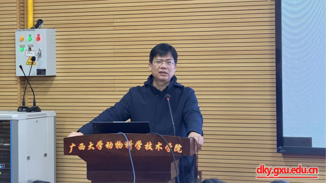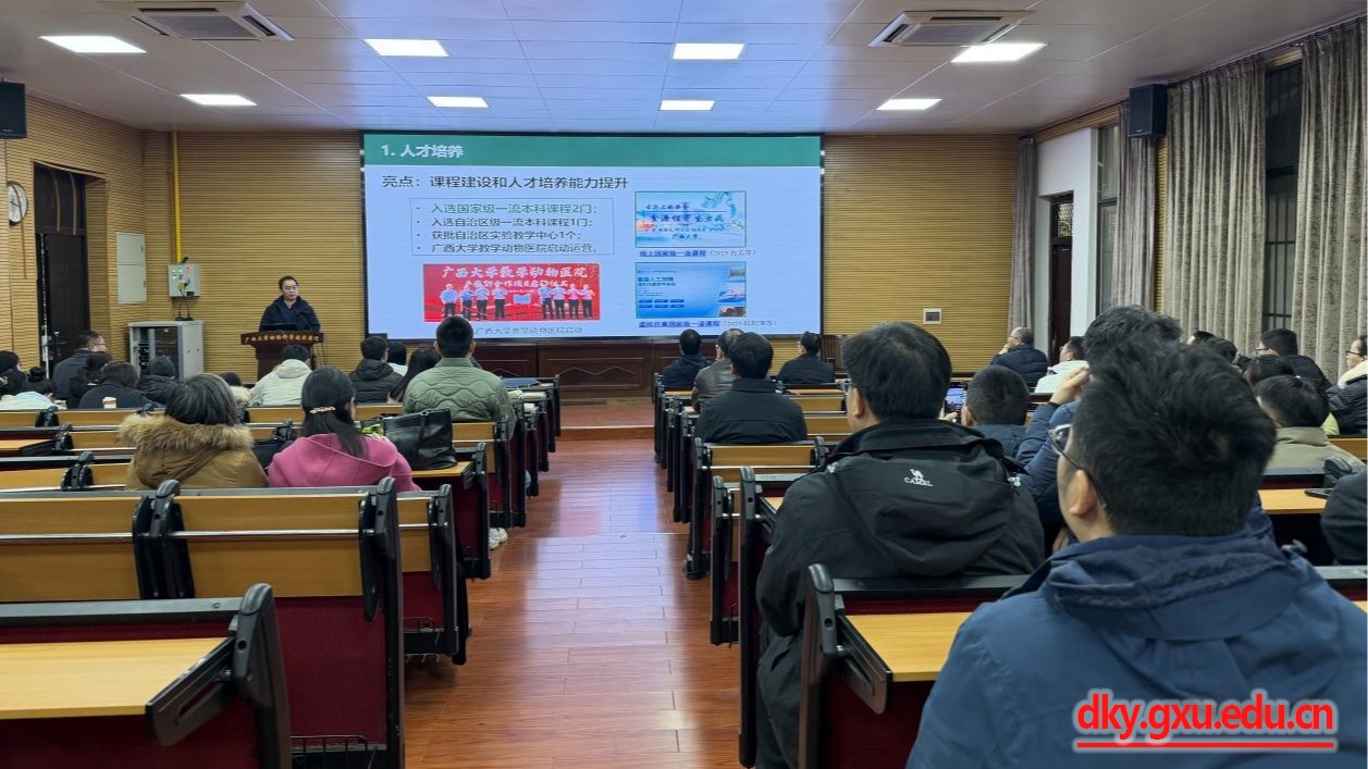 1月22日下午,广西大学动物科学技术学院在318报告厅召开2025年秋季学期期末教职工大会。动物科学技术学院党委书记韦小强,院长陆阳清,党委副书记杨雪,副院长何家康、韦祖樟、蒋钦杨及全体教职工参加会议,会议由郭爱涛副院长主持。