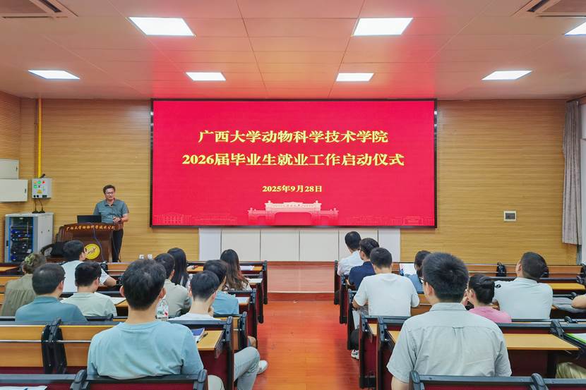 为全面贯彻落实党中央、国务院和自治区党委、政府关于做好高校毕业生就业工作的决策部署,提前谋划2026届毕业生就业工作,9月28日下午,广西大学动物科学技术学院在学院318报告厅举行2026届毕业生就业工作启动仪式。动物科学技术学院党委书记韦小强,副院长蒋钦杨,以及各毕业班班主任、辅导员参加仪式。