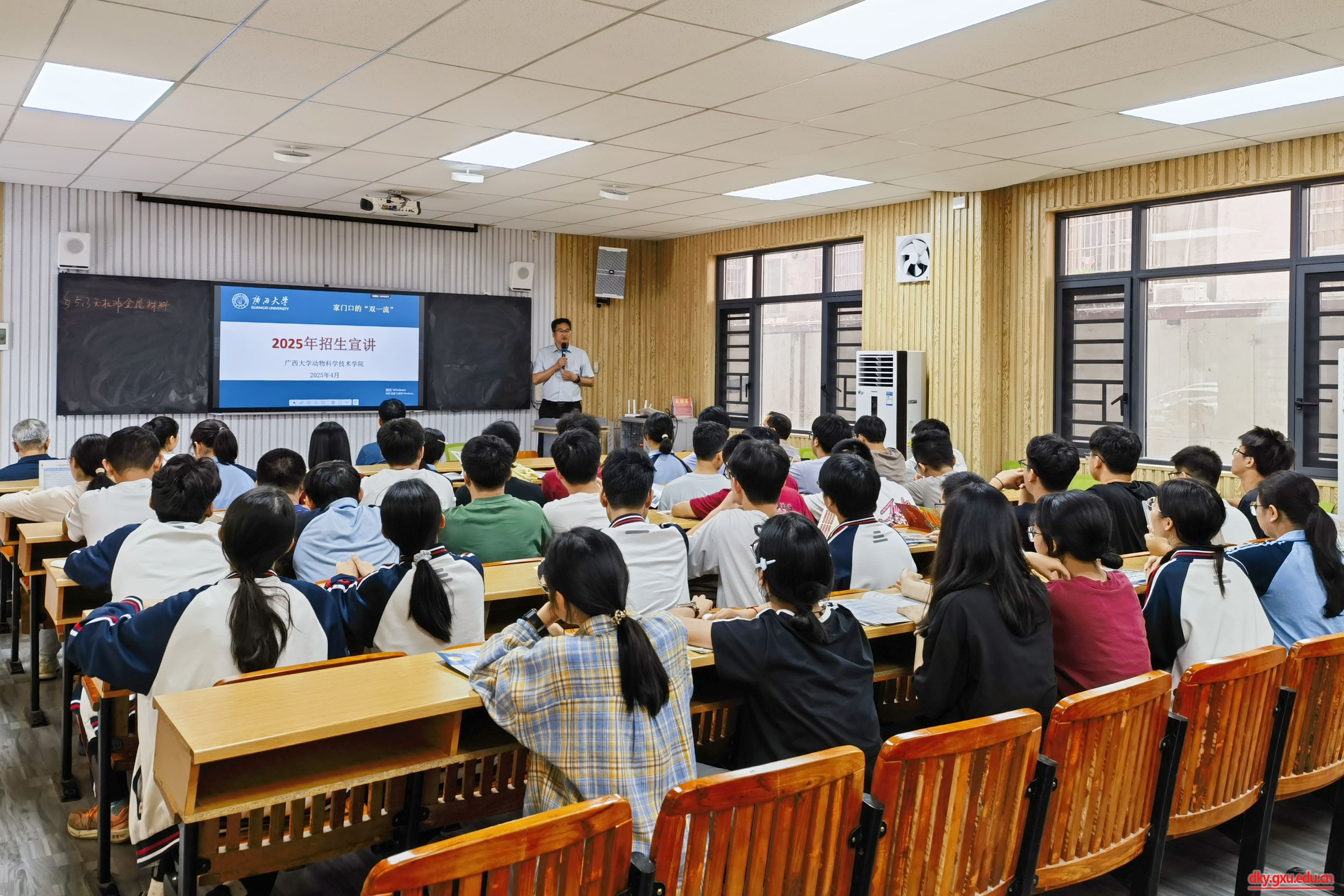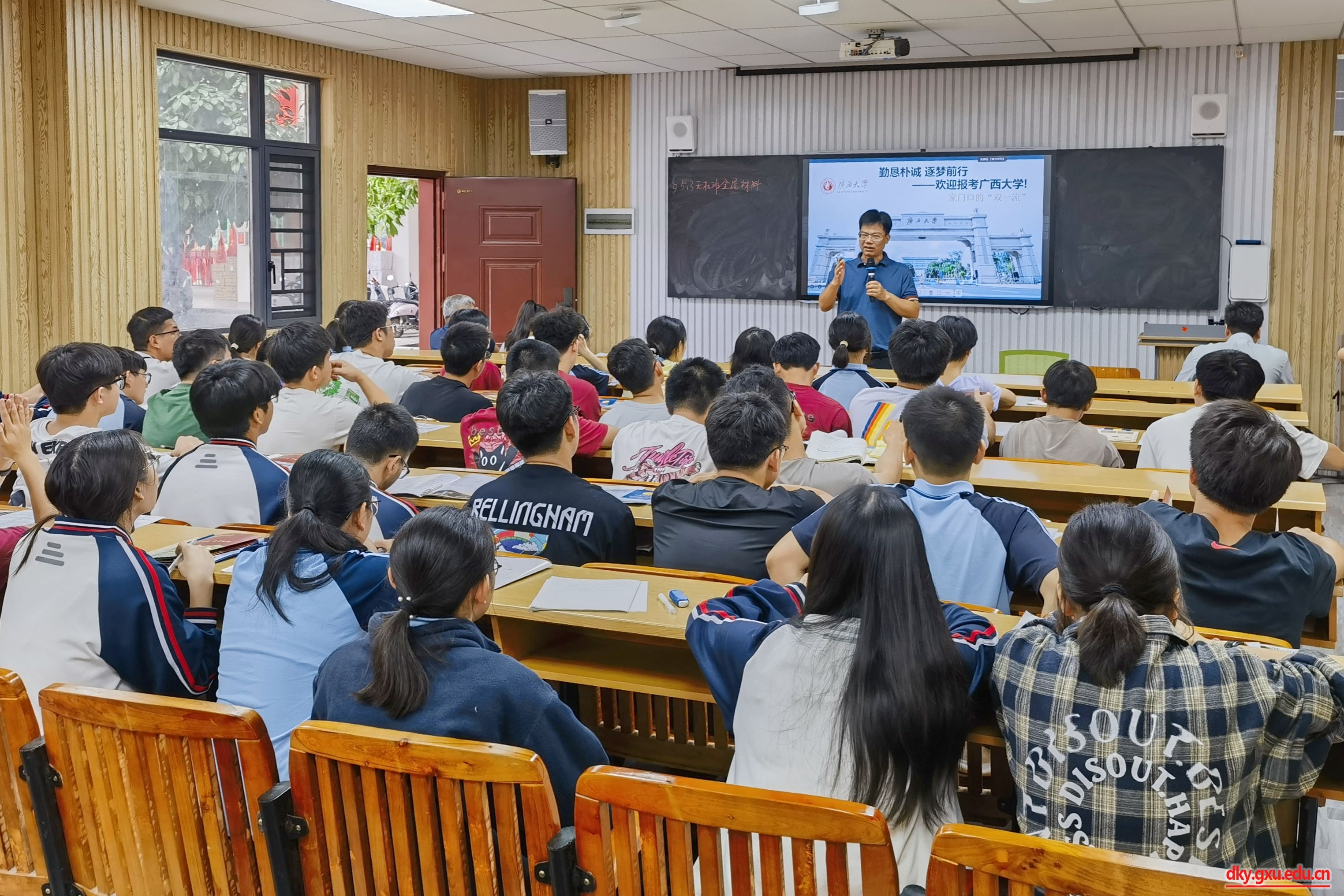 在大化县高级中学,蒋钦杨老师向同学们详细介绍了广西大学的历史沿革、办学特色、招生政策,以及动物科学技术学院的学科优势、教育资源、就业前景等。韦小强书记耐心细致地解答了同学们的提问,重点说明招生计划、志愿填报等注意事项,并鼓励大家以最佳状态、最好风貌迎战高考。