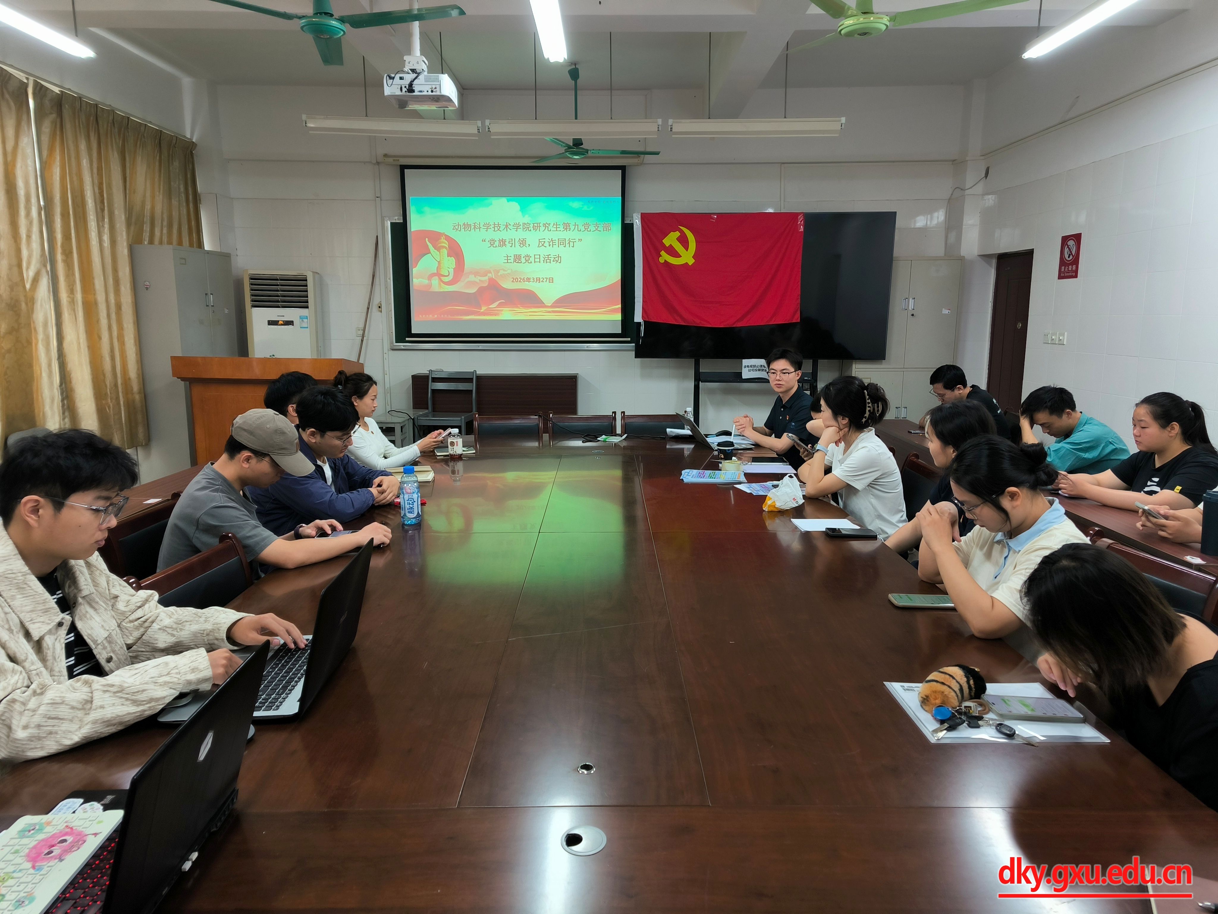 为深入贯彻落实习近平总书记关于打击治理电信网络诈骗犯罪的重要指示精神,切实提升在校学生反诈防骗意识与能力,筑牢校园安全防线,3月27日,广西大学动物科学技术学院研究生第九党支部组织开展“党旗引领,反诈同行”主题党日活动,支部通过“宣讲+走访”,将反诈知识精准传递到同学们身边,以实际行动彰显学生党员的责任担当。